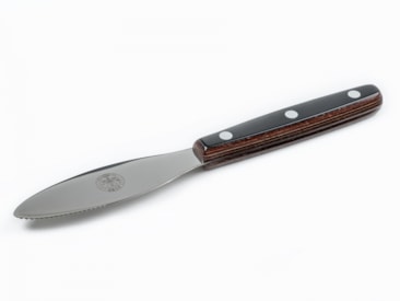 En kniv med ovalt, bredt og fleksibelt blad som gjør det enkelt å smøre ut pålegg og annet. Skaftet er i materialet Polyoxymethylen og rosentre.